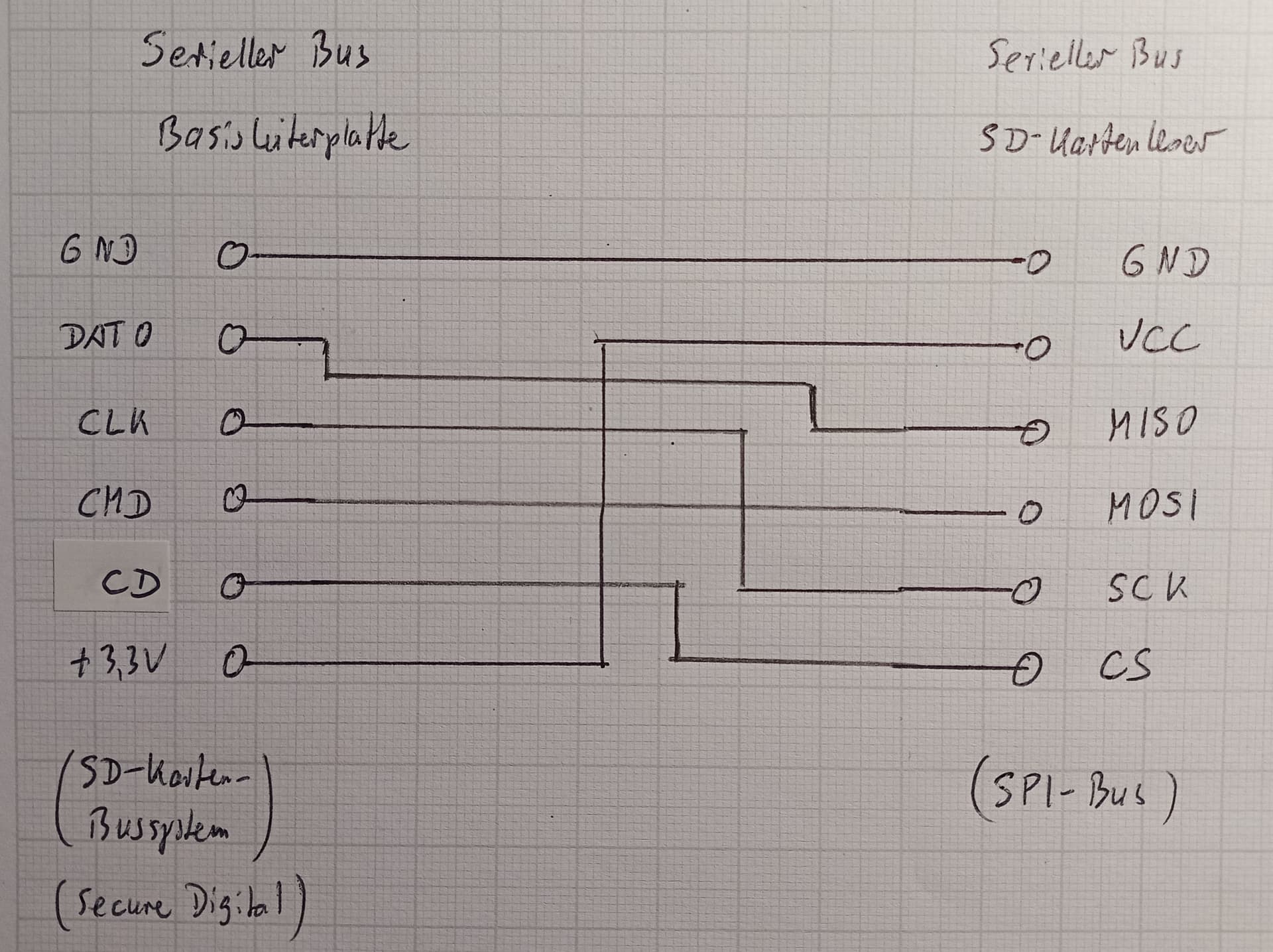 Hallo, wir bauen z.Zt. einige OpenBikeSensoren zusammen, grundsätzlich funktioniert bei den ersten Mustern alles bis auf den microSD Card Reader. Die Beschriftung auf der Hauptplatine (Version 1.0.0) für das microSD Card Reader Modul ist mit GND, DAT0, CLK, CMD, CD und +3,3V angegeben, das sind die Signalbezeichungen für das alte SD-Card Bussystem. Unser SD Card Reader hat aber einen SPI-Bus (Signalbezeichungen CS, SCK, MOSI, MISO, VCC und GND). Sind diese Bussysteme kompatibel? D.h. kann man bei entsprechender Verbindung der Signale auch einen SD Card Reader Modul mit SPI-Bus einbauen? So wie im Bild angegeben? Danke vorab für die Hilfe!