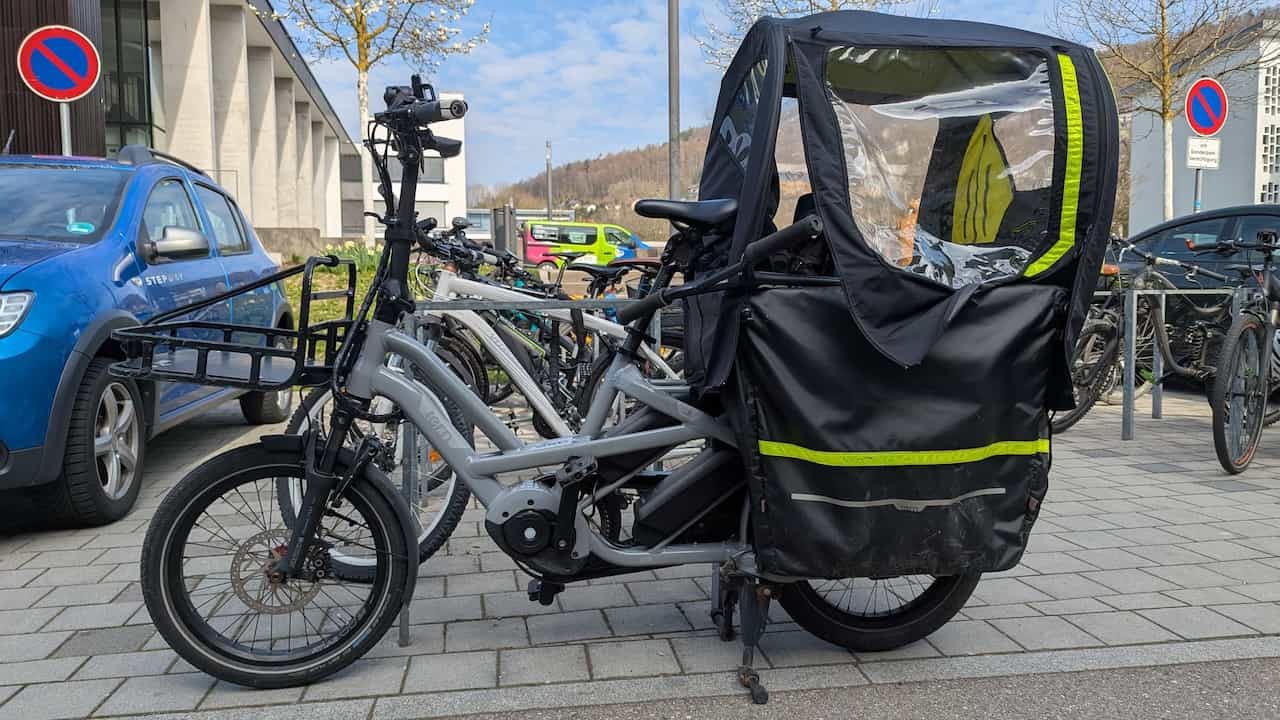 Hinter dem Sattel befindet sich die Box mit 2 Kindern / sonstiger Ladung. Auf dem vorderen Gepäckträger befinden sich mal Kisten, mal Schulranzen oder auch Fahrräder zum Transport, die auch über den Lenker hinausragen können.