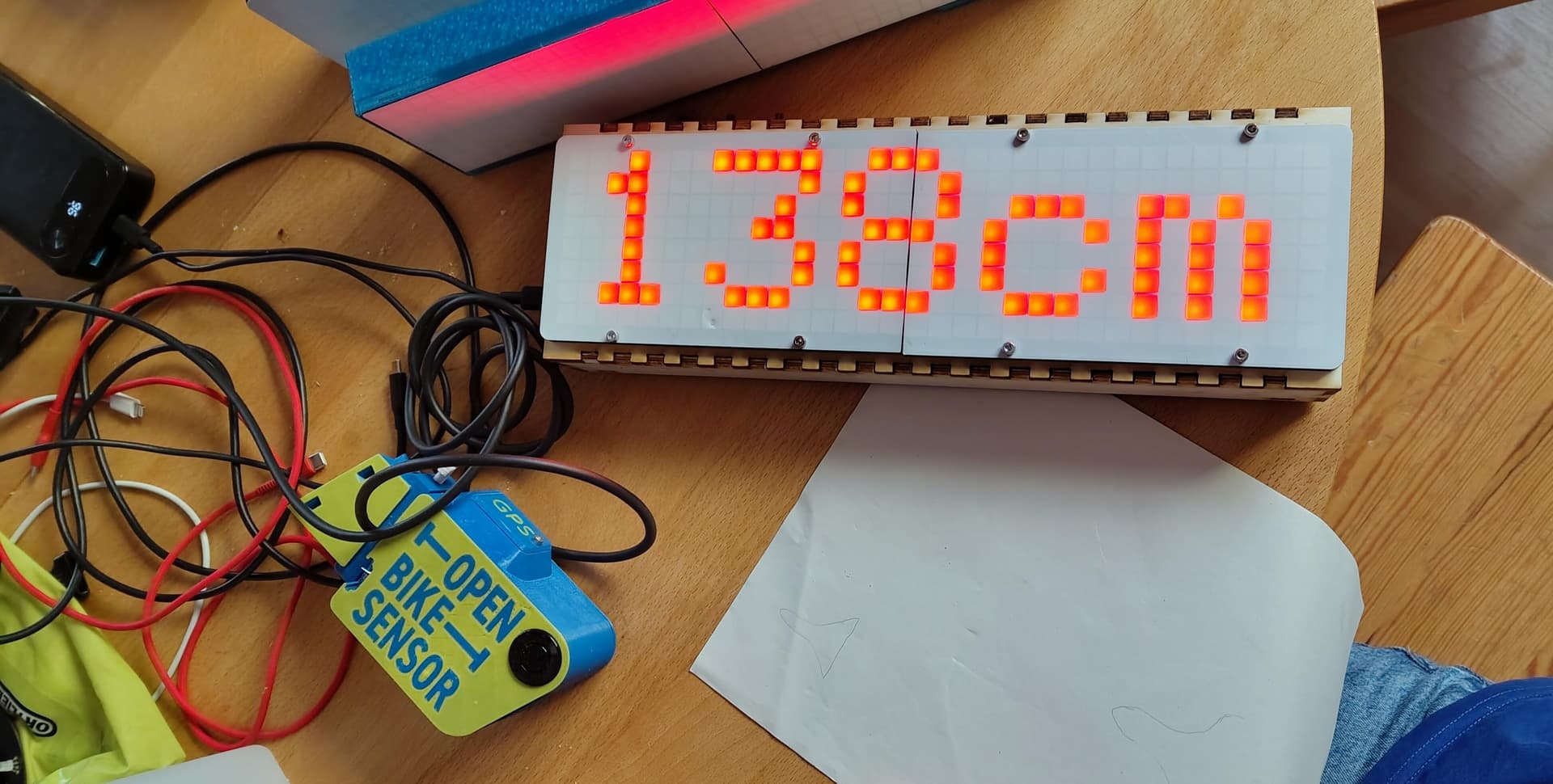 Worum handelt es sich dabei? Ein Display auf Basis einer 32x8 Pixel LED Matrix, das man z.B. auf Fahrradaktionstagen, Messen oder ähnlichem verwenden kann, um die vom OpenBikeSensor per Bluetooth verschickten Abstandsmessungen groß und leuchtend anzuzeigen.